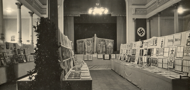 Eine NS-Kunst-Ausstellung im Lübecker Kolosseum zeigt 1938 deutlich den Kontext, in den die Flath'schen Werke gestellt wurden. Hinten sieht man den großen für die Lübecker St. Lorenz-Kirche